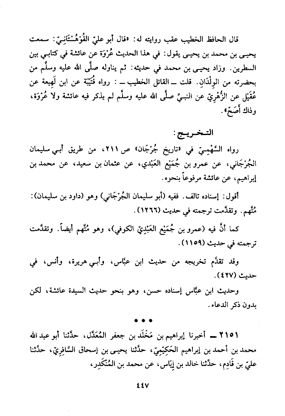 ٢١٥١ - أخبرنا إبراهيم بن مَخْلَد بن جعفر المُعَدَّل، حدَّثنا أبو عبد اللَّه محمد بن أحمد بن إبراهيم الحَكِيْمِيّ، حدَّثنا يحيى بن إسحاق السَّافِرِيّ، حدَّثنا عليّ بن قَادِم، حدَّثنا خالد بن إيّاس، عن محمد بن المُنْكَدِر،