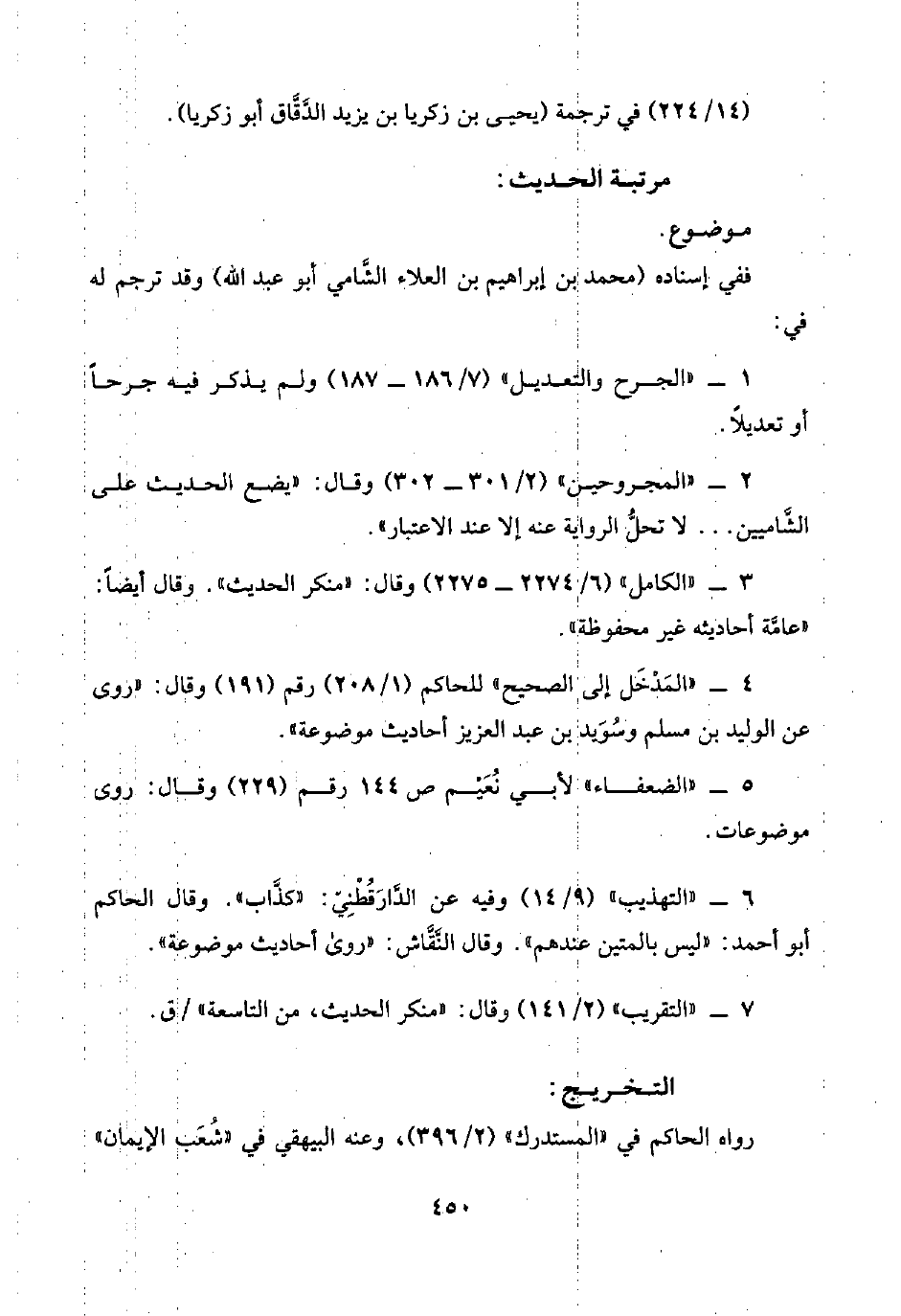 ٣ - "الكامل" (٦/ ٢٢٧٤ - ٢٢٧٥) وقال: "منكر الحديث". وقال أيضًا: "عامَّة أحاديثه غير محفوظة".