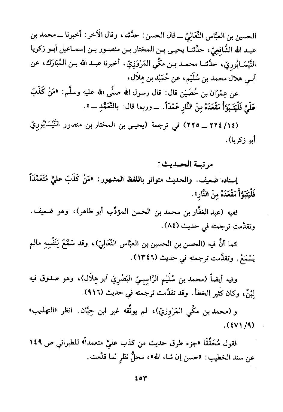 عن عِمْرَان بن حُصَيْن قال: قال رسول اللَّه صلَّى اللَّه عليه وسلَّم: "مَنْ كَذَبَ عَلَيَّ فَلْيَتَبَوَّأْ مَقْعَدَهُ مِنَ النَّارِ عَمْدًا. -وربما قال: بالتَّعَمُّدِ-".