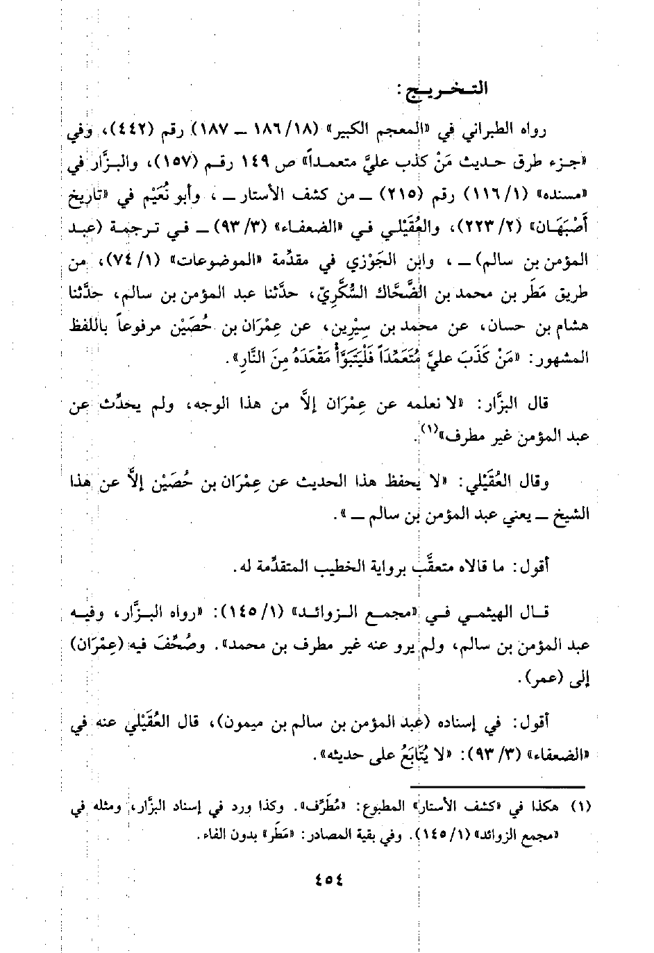 قال الهيثمي في "مجمع الزوائد" (١/ ١٤٥): "رواه البزَّار، وفيه عبد المؤمن بن سالم، ولم يرو عنه غير مطرف بن محمد". وصُحِّفَ فيه (عِمْران) إلى (عمر).
