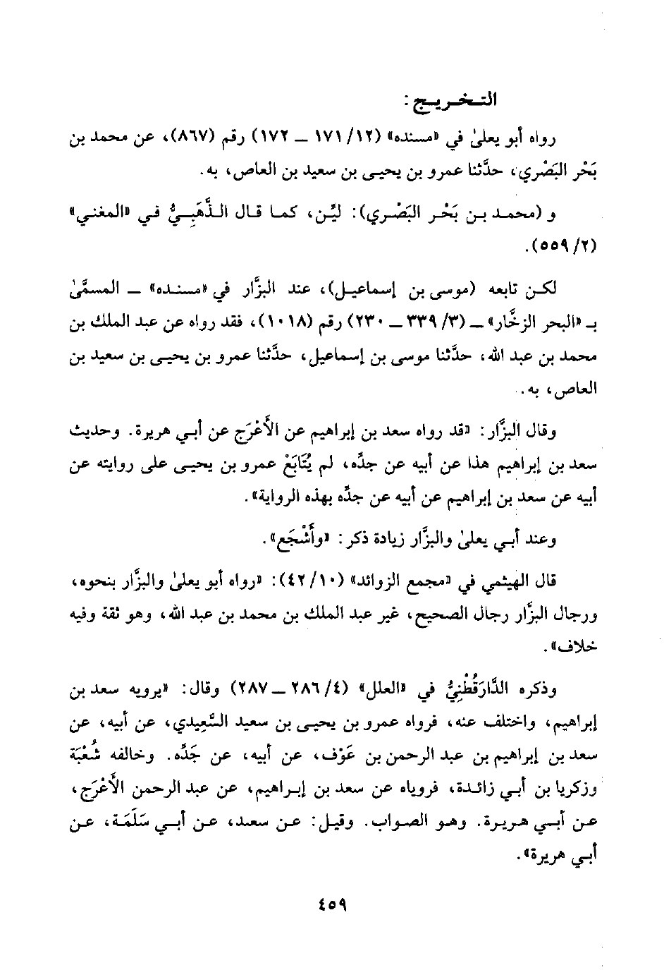 وقال البزَّار: "قد رواه سعد بن إبراهيم عن الأَعْرَج عن أبي هريرة. وحديث سعد بن إبراهيم هذا عن أبيه عن جَدِّه، لم يُتَابَعُ عمرو بن يحيى على روايته عن أبيه عن سعد بن إبراهيم عن أبيه عن جَدِّه بهذه الرواية".