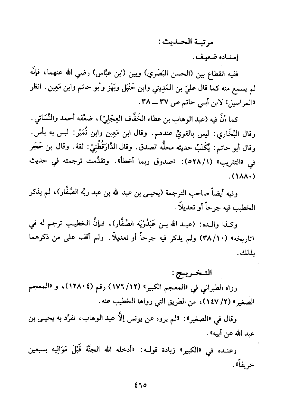 كما أنَّ فيه (عبد الوهاب بن عطاء الخَفَّاف العِجْلِيّ)، ضعَّفه أحمد والنَّسَائي. وقال البُخَاري: ليس بالقويِّ عندهم. وقال ابن مَعِين وابن نُمَيْر: ليس به بأس. وقال أبو حاتم: يُكْتَبُ حديثه محلُّه الصدق. وقال الدَّارَقُطْنِيّ: ثقة. وقال ابن حَجَر في "التقريب" (١/ ٥٢٨): "صدوق ربما أخطأ". وتقدَّمت ترجمته في حديث (١٨٨٠).