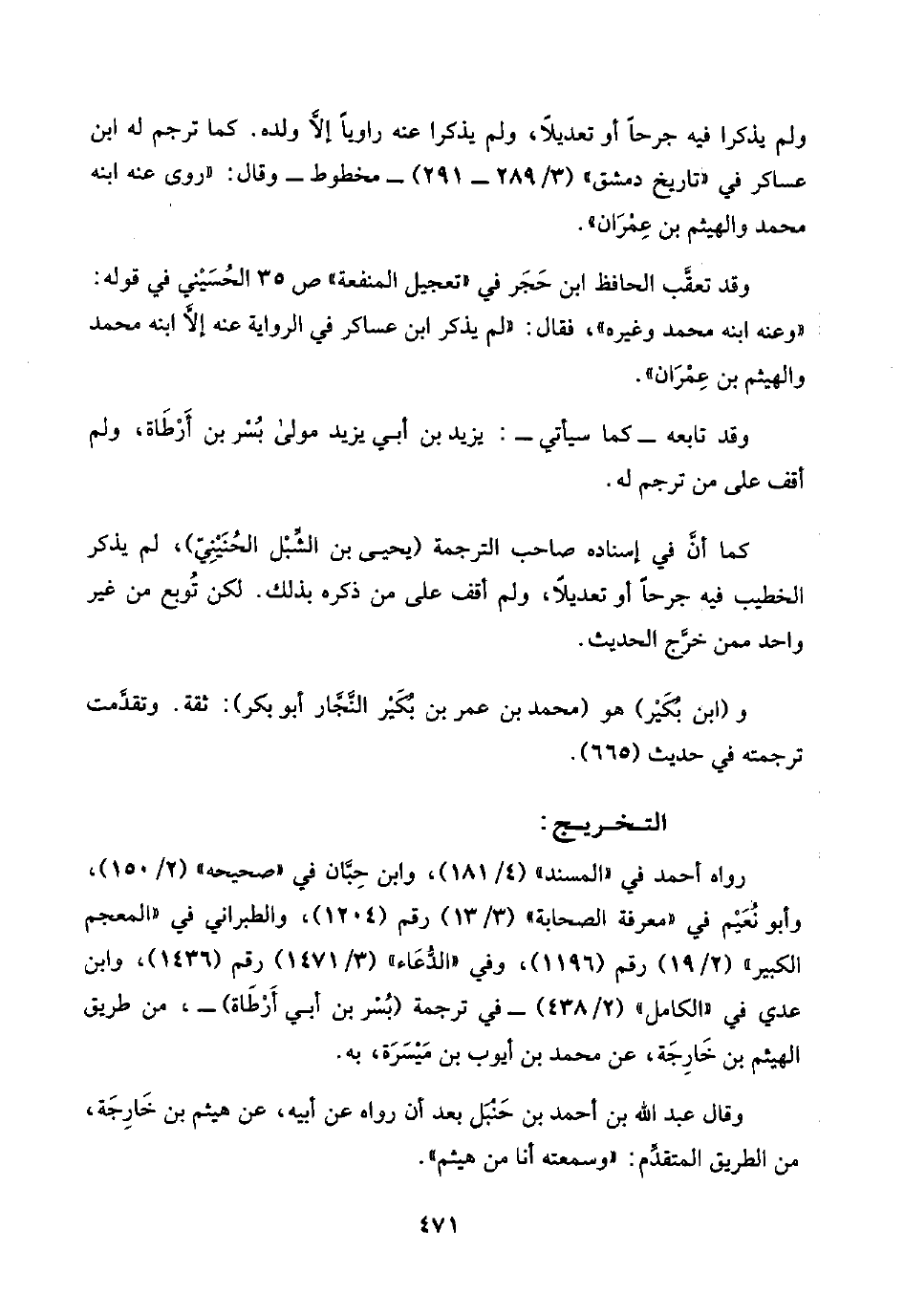 ولم يذكرا فيه جرحًا أو تعديلًا، ولم يذكرا عنه راويًا إلَّا ولده. كما ترجم له ابن عساكر في "تاريخ دمشق" (٣/ ٢٨٩ - ٢٩١) -مخطوط- وقال: "روى عنه ابنه محمد والهيثم بن عِمْرَان".