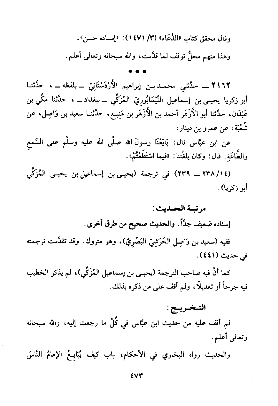 ٢١٦٢ - حدَّثني محمد بن إبراهيم الأَرْدَسْتَانِيّ -بلفظه-، حدَّثنا أبو زكريا يحيى بن إسماعيل النَّيْسَابُورِيّ المُزَكِّي -ببغداد-، حدَّثنا مكِّي بن عَبْدَان، حدَّثنا أبو الأَزْهَر أحمد بن الأَزْهَر بن مَنِيع، حدَّثنا سعيد بن وَاصِل، عن شُعْبَة، عن عمرو بن دينار،