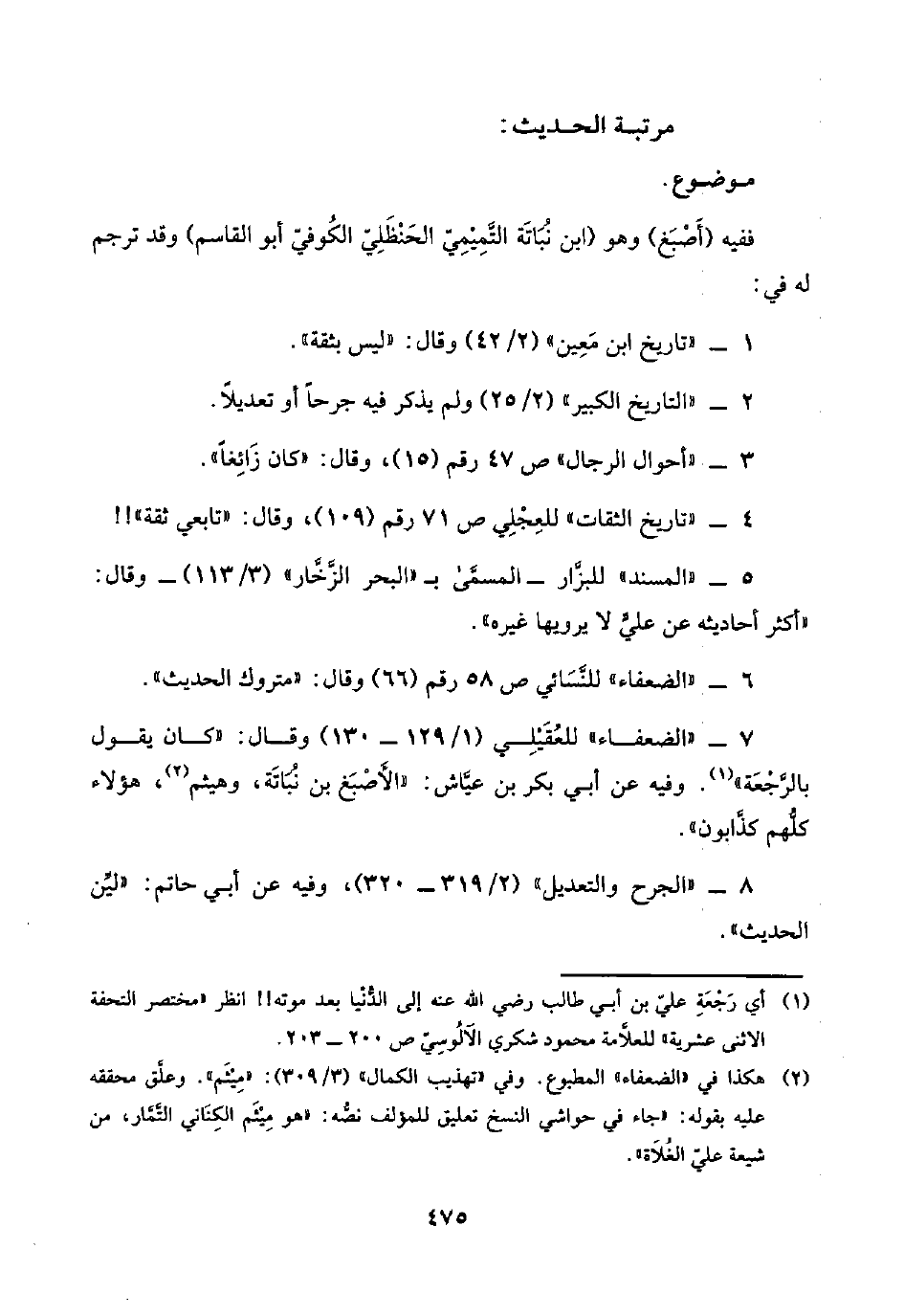 ٧ - "الضعفاء" للعُقَيْلِي (١/ ١٢٩ - ١٣٠) وقال: "كان يقول بالرَّجْعَة" (¬١). وفيه عن أبي بكر بن عيَّاش: الأَصْبَغ بن نُبَاتَة، وهيثم (¬٢)، هؤلاء كلُّهم كذَّابون".