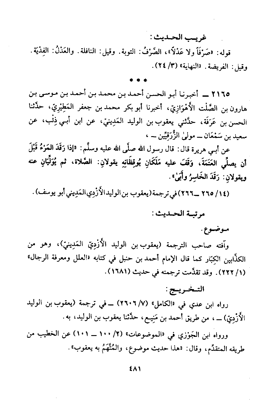 ٢١٦٥ - أخبرنا أبو الحسن أحمد بن محمد بن أحمد بن موسى بن هارون بن الصَّلْت الأَهْوَازِيّ، أخبرنا أبو بكر محمد بن جعفر المَطِيْرِيّ، حدَّثنا الحسن بن عَرَفَة، حدَّثني يعقوب بن الوليد المَدِينيّ، عن ابن أبي ذِئْب، عن سعيد بن سَمْعَان -مولى الزُّرَقِيِّين-،