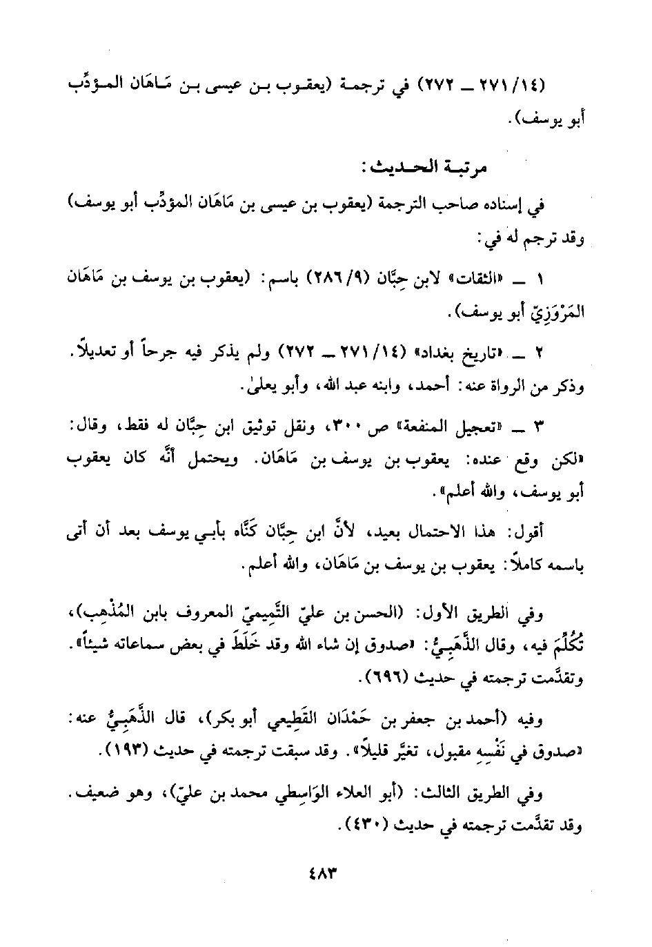 ٣ - "تعجيل المنفعة" ص ٣٠٠، ونقل توثيق ابن حِبَّان له فقط، وقال: "لكن وقع عنده: يعقوب بن يوسف بن مَاهَان. ويحتمل أنَّه كان يعقوب أبو يوسف، واللَّه أعلم".