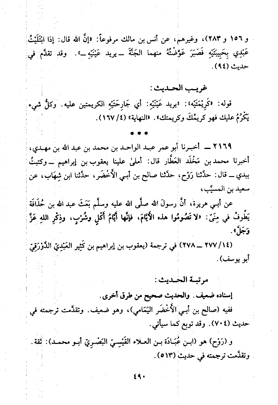 ٢١٦٩ - أخبرنا أبو عمر عبد الواحد بن محمد بن عبد اللَّه بن مهدي، أخبرنا محمد بن مَخْلَد العطَّار قال: أملى علينا يعقوب بن إبراهيم -وكتبُ بيدي- قال: حدَّثنا رَوْح، حدَّثنا صالح بن أبي الأَخْضَر، حدَّثنا ابن شِهَاب، عن سعيد بن المسيَّب،