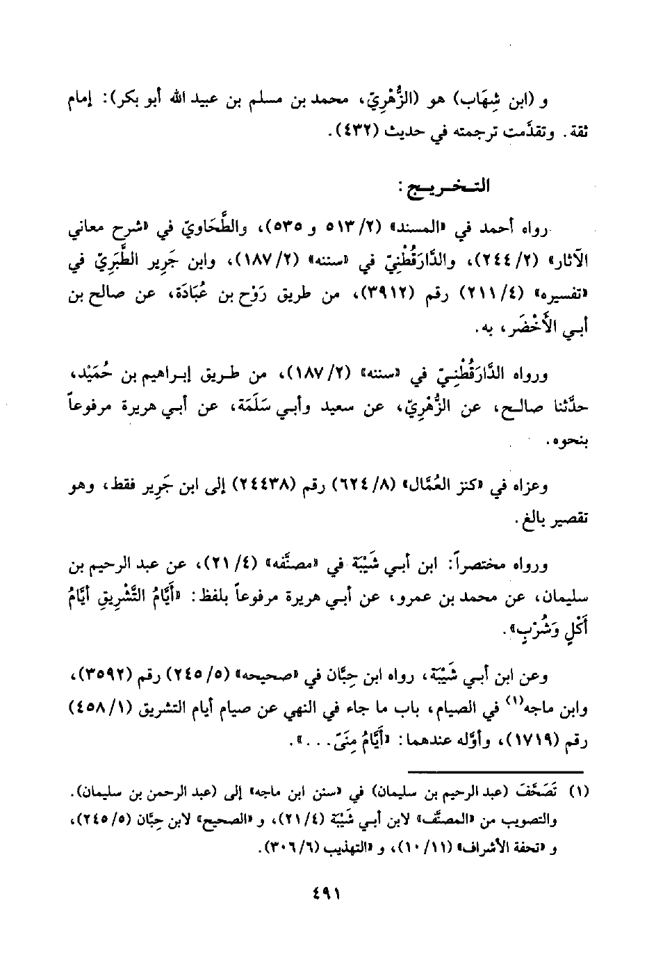 ورواه مختصرًا: ابن أبي شَيْبَة في "مصنَّفه" (٤/ ٢١)، عن عبد الرحيم بن سليمان، عن محمد بن عمرو، عن أبي هريرة مرفوعًا بلفظ: "أَيَّامُ التَّشْرِيقِ أيَّامُ أَكْلٍ وَشُرْبٍ".