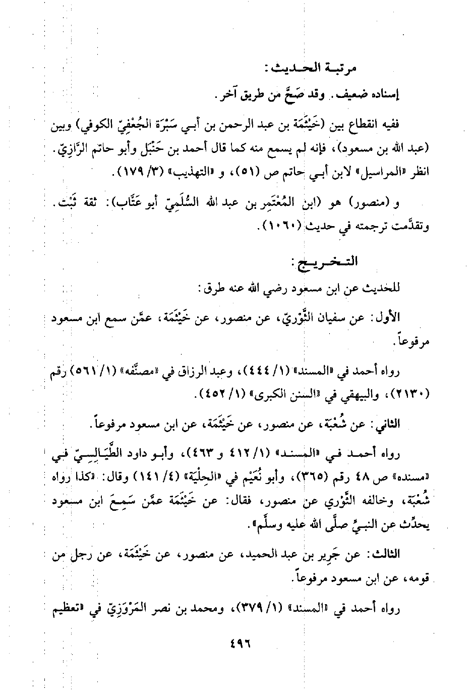 رواه أحمد في "المسند" (١/ ٤١٢ و ٤٦٣)، وأبو داود الطَّيَالِسِيّ في "مسنده" ص ٤٨ رقم (٣٦٥)، وأبو نُعَيْم في "الحِلْيَة" (٤/ ١٤١) وقال: "كذا رواه شُعْبَة، وخالفه الثَّوْري عن منصور، فقال: عن خَيْثَمَة عمَّن سَمِعَ ابن مسعود يحدِّث عن النبيِّ صلَّى اللَّه عليه وسلَّم".