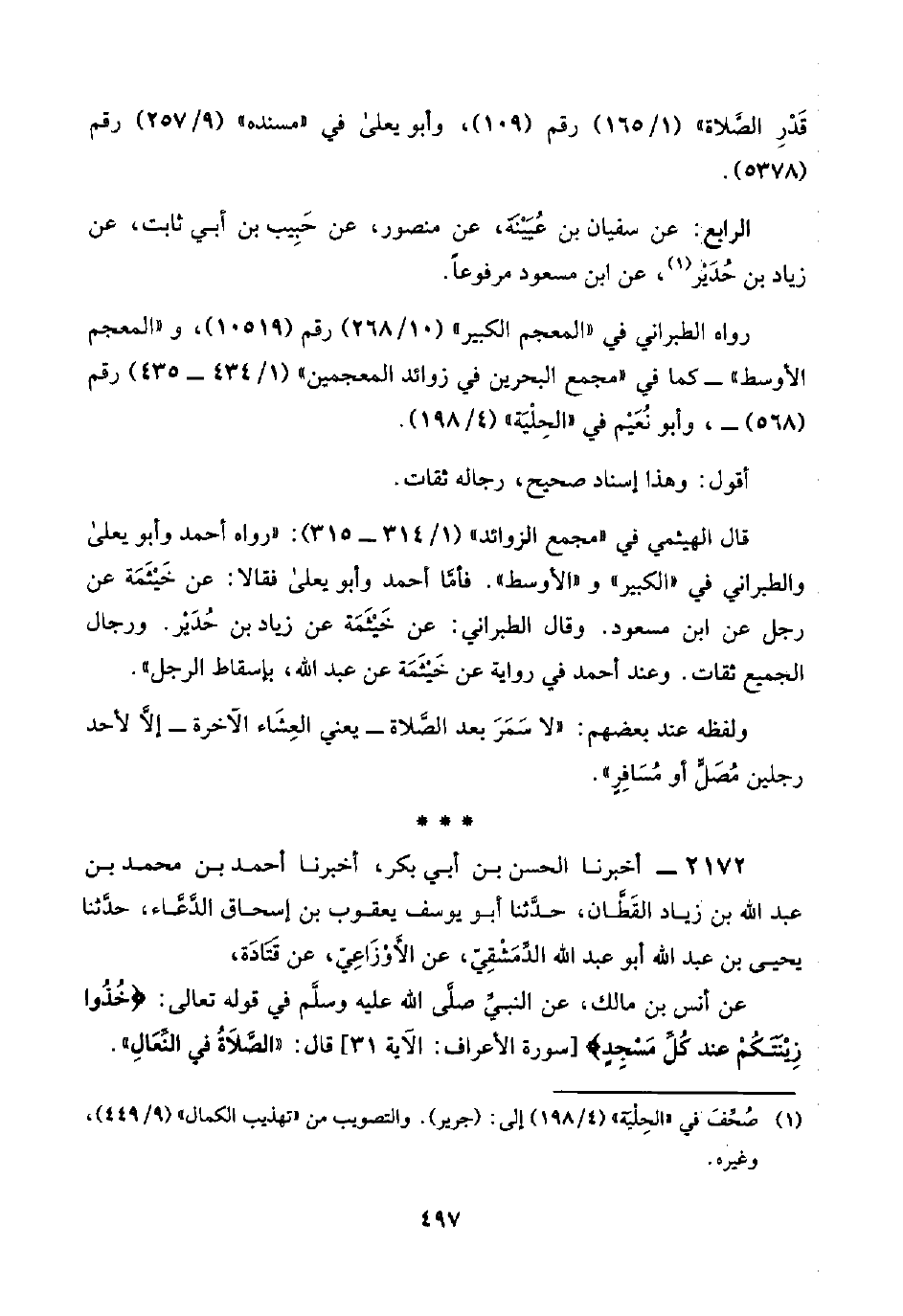 قال الهيثمي في "مجمع الزوائد" (١/ ٣١٤ - ٣١٥): "رواه أحمد وأبو يعلى والطبراني في "الكبير" و"الأوسط". فأمَّا أحمد وأبو يعلى فقالا: عن خَيْثَمَة عن رجل عن ابن مسعود. وقال الطبراني: عن خَيْثَمَة عن زياد بن حُدَيْر. ورجال الجميع ثقات. وعند أحمد في رواية عن خَيْثَمَة عن عبد اللَّه، بإسقاط الرجل".