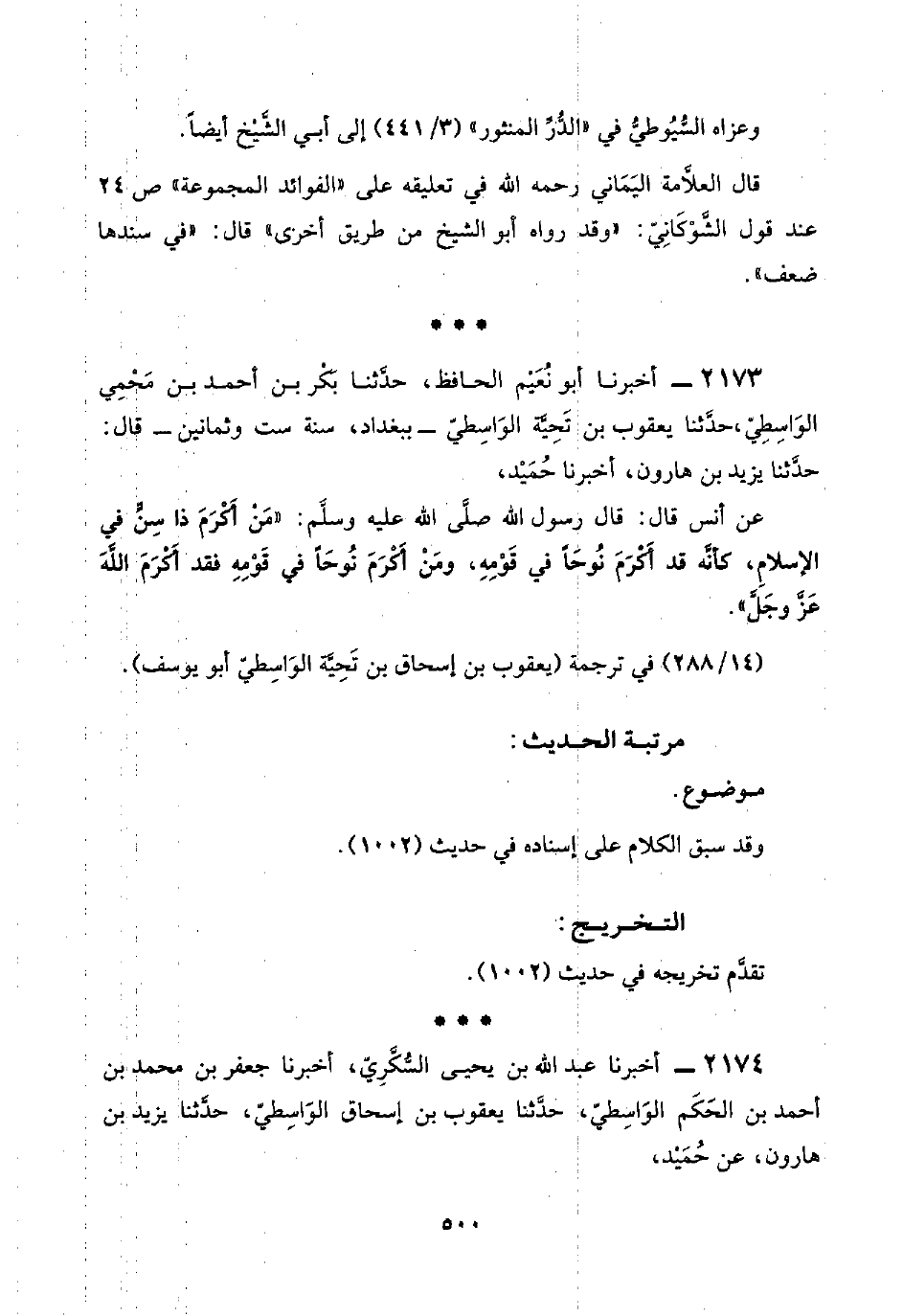 ٢١٧٣ - أخبرنا أبو نُعَيْم الحافظ، حدَّثنا بَكْر بن أحمد بن مَحْمِي الوَاسِطِيّ، حدَّثنا يعقوب بن تَحِيَّة الوَاسِطيّ -ببغداد، سنة ست وثمانين- قال: حدَّثنا يزيد بن هارون، أخبرنا حُمَيْد،
