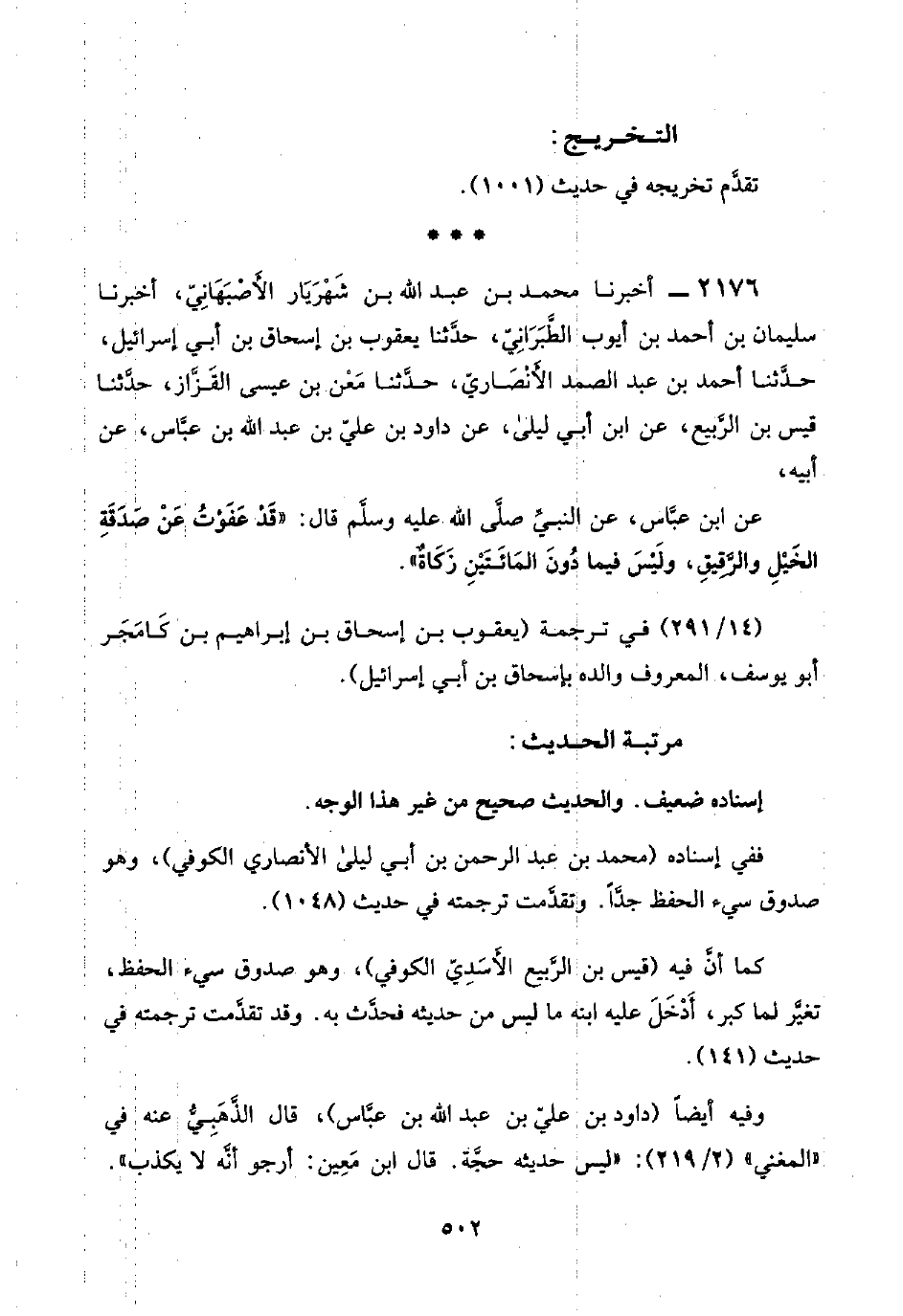 عن ابن عبَّاس، عن النبيِّ صلَّى اللَّه عليه وسلَّم قال: "قَدْ عَفَوْتُ عَنْ صَدَقَةِ الخَيْلِ والرَّقِيقِ، ولَيْسَ فيما دُونَ المَائَتَيْنِ زَكَاةٌ".