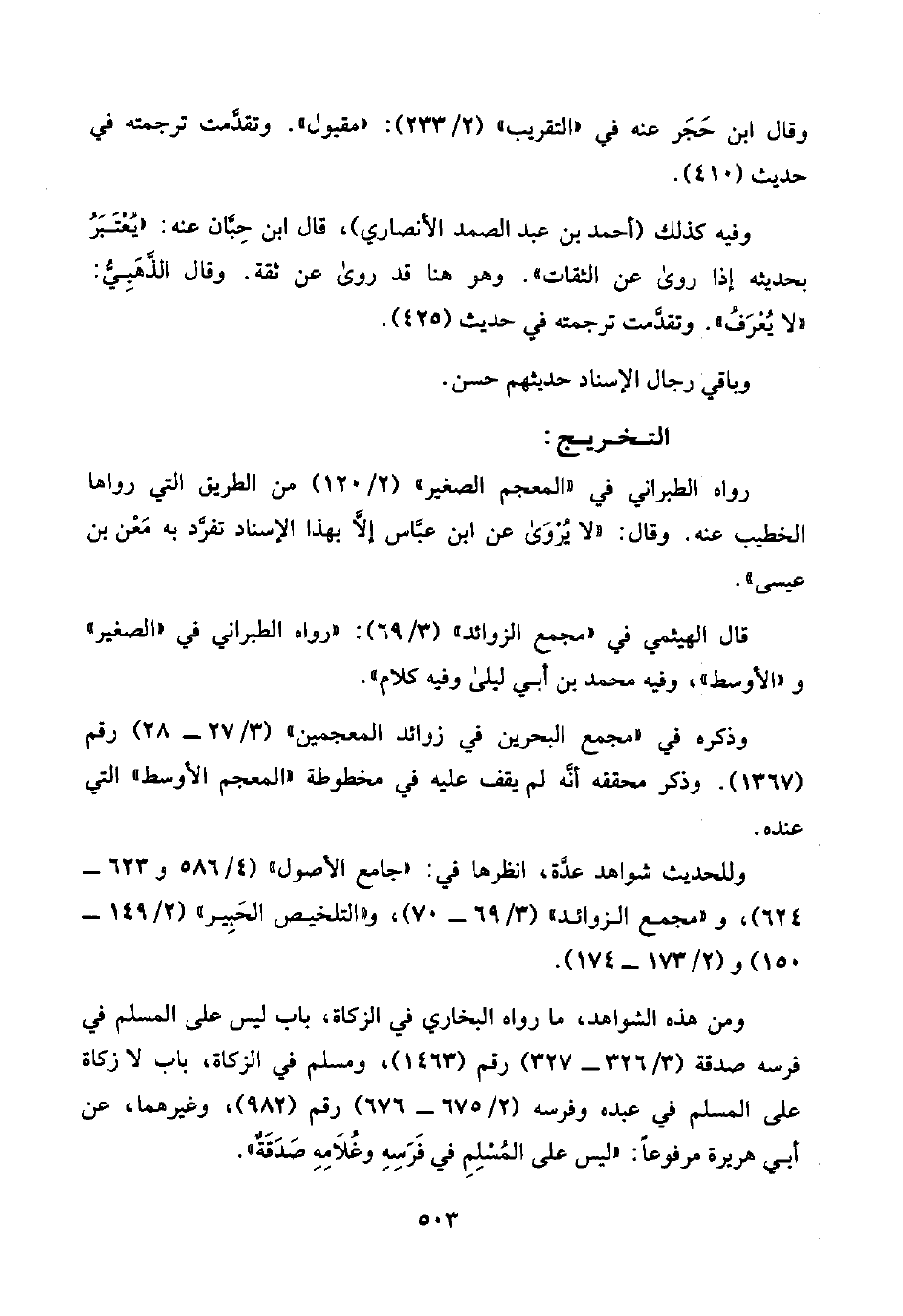 ومن هذه الشواهد، ما رواه البخاري في الزكاة، باب ليس على المسلم في فرسه صدقة (٣/ ٣٢٦ - ٣٢٧) رقم (١٤٦٣)، ومسلم في الزكاة، باب لا زكاة على المسلم في عبده وفرسه (٢/ ٦٧٥ - ٦٧٦) رقم (٩٨٢)، وغيرهما، عن أبي هريرة مرفوعًا: "ليس على المُسْلِمِ في فَرَسِهِ وغُلَامِهِ صَدَقَةٌ".