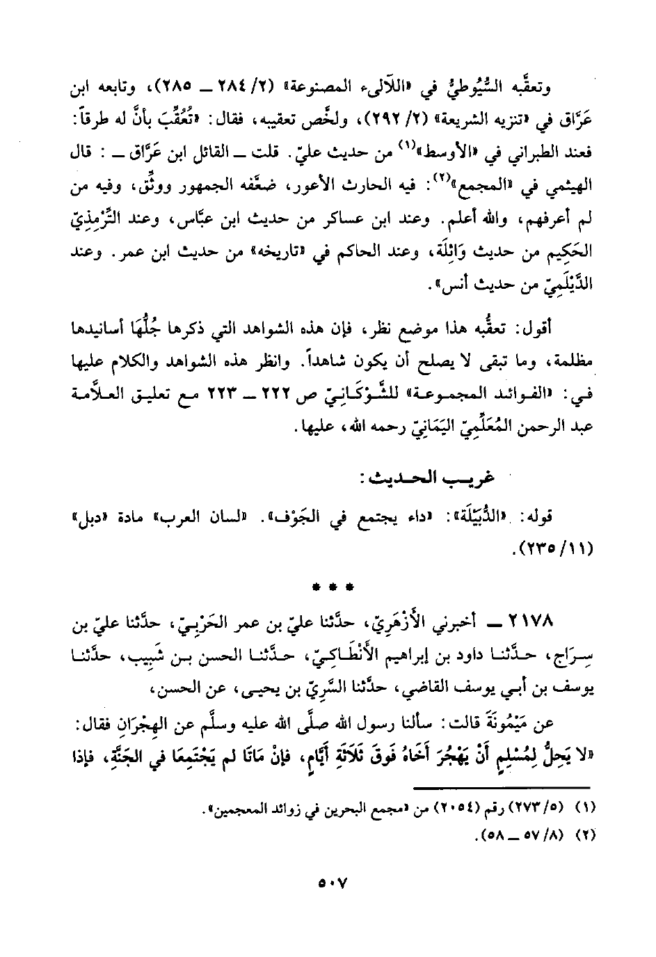 أقول: تعقُّبه هذا موضع نظر، فإن هذه الشواهد التي ذكرها جُلُّهَا أسانيدها مظلمة، وما تبقى لا يصلح أن يكون شاهدًا. وانظر هذه الشواهد والكلام عليها في: "الفوائد المجموعة" للشَّوْكَانِيّ ص ٢٢٢ - ٢٢٣ مع تعليق العلَّامة عبد الرحمن المُعَلِّمِيّ اليَمَانِيّ رحمه اللَّه، عليها.