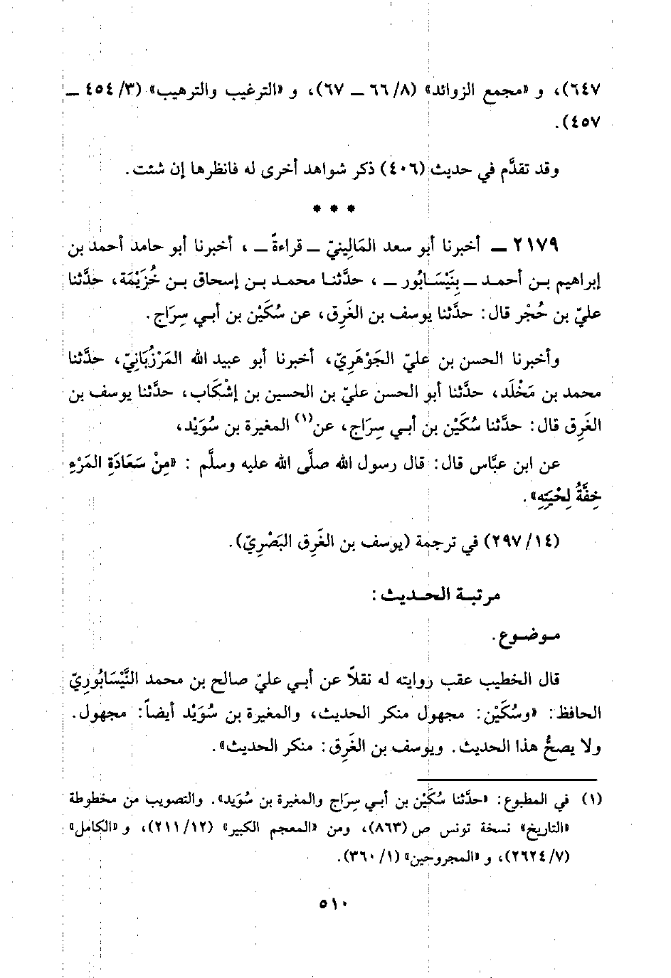 ٢١٧٩ - أخبرنا أبو سعد المَالِينيّ -قراءةً-، أخبرنا أبو حامد أحمد بن إبراهيم بن أحمد -بِنَيْسَابُور-، حدَّثنا محمد بن إسحاق بن خُزَيْمَة، حدَّثنا عليّ بن حُجْر قال: حدَّثنا يوسف بن الغَرِق، عن سُكَيْن بن أبي سِرَاج.