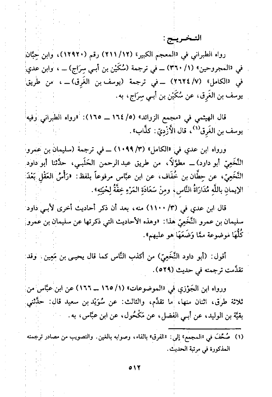 ورواه ابن عدي في "الكامل" (٣/ ١٠٩٩) -في ترجمة (سليمان بن عمرو النَّخَعِيّ أبو داود) - مطوَّلًا، من طريق عبد الرحمن الحَلَبي، حدَّثنا أبو داود النَّخَعِيّ، عن حِطَّان بن خُفَاف، عن ابن عبَّاس مرفوعًا بلفظ: "رَأْسُ العَقْلِ بَعْدَ الإيمانِ باللَّهِ مَدَارَاةُ النَّاسِ، ومِنْ سَعَادَةِ المَرْءِ خِفَّهُ لِحْيَتِهِ".
