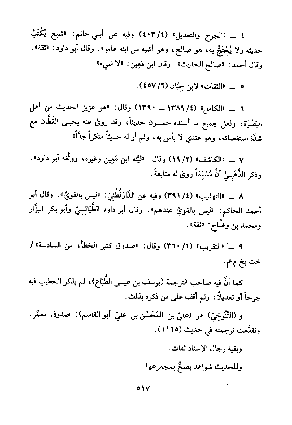 ٨ - "التهذيب" (٤/ ٣٩١) وفيه عن الدَّارَقُطْنِيّ: "ليس بالقويِّ". وقال أبو أحمد الحاكم: ليس بالقويِّ عندهم". وقال أبو داود الطَّيَالِسِيّ وأبو بكر البزَّار ومحمد بن وضَّاح: "ثقة".
