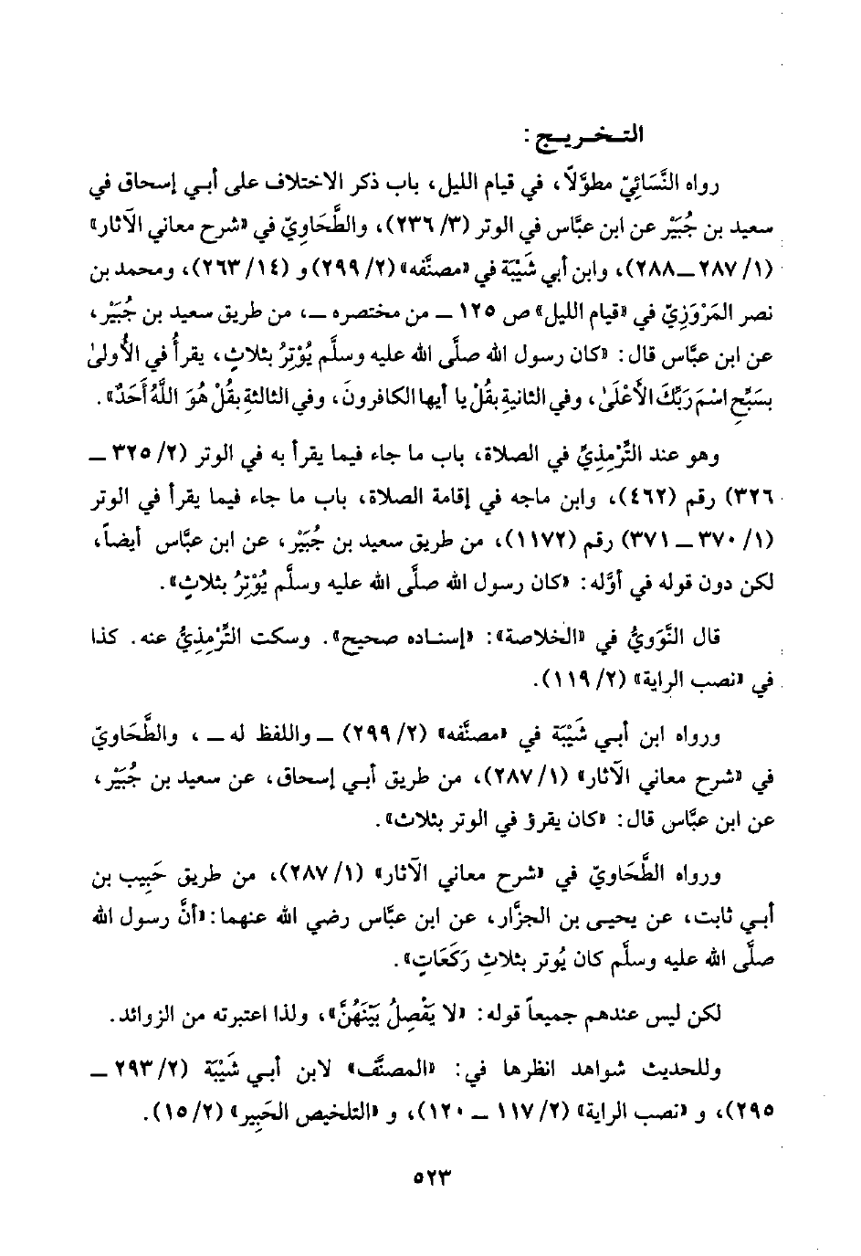 رواه النَّسَائِيّ مطوَّلًا، في قيام الليل، باب ذكر الاختلاف على أبي إسحاق في سعيد بن جُبَيْر عن ابن عبَّاس في الوتر (٣/ ٢٣٦)، والطَّحَاوِيّ في "شرح معاني الآثار" (١/ ٢٨٧ - ٢٨٨)، وابن أبي شَيْبَة في "مصنَّفه" (٢/ ٢٩٩) و (١٤/ ٢٦٣)، ومحمد بن نصر المَرْوَزِيّ في "قيام الليل" ص ١٢٥ - من مختصره-، من طريق سعيد بن جُبَيْر، عن ابن عبَّاس قال: "كان رسول اللَّه صلَّى اللَّه عليه وسلَّم يُوْتِرُ بثلاثٍ، يقرأُ في الأُولى بسَبِّحِ اسْمَ رَبِّكَ الأَعْلَى، وفي الثانيةِ بقُلْ يا أيها الكافرونَ، وفي الثالثةِ بقُلْ هُوَ اللَّهُ أَحَدٌ".