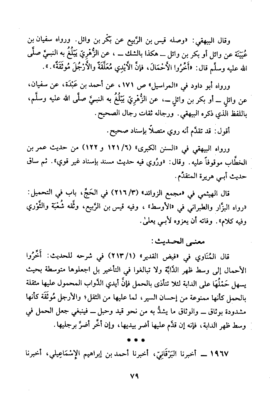 وقال البيهقي: "وصله قيس بن الرَّبيع عن بَكْر بن وائل. ورواه سفيان بن عُيَنْيَة عن وائل أو بكر بن وائل -هكذا بالشك-، عن الزُّهْرِيّ يَبْلُغْ به النبيَّ صلَّى اللَّه عليه وسلَّم قال: "أَخِّرُوا الأَحْمَالَ، فإنَّ الأَيْدِي مُعَلَّقةٌ والأَرْجُلَ مُوثَقَةٌ".".