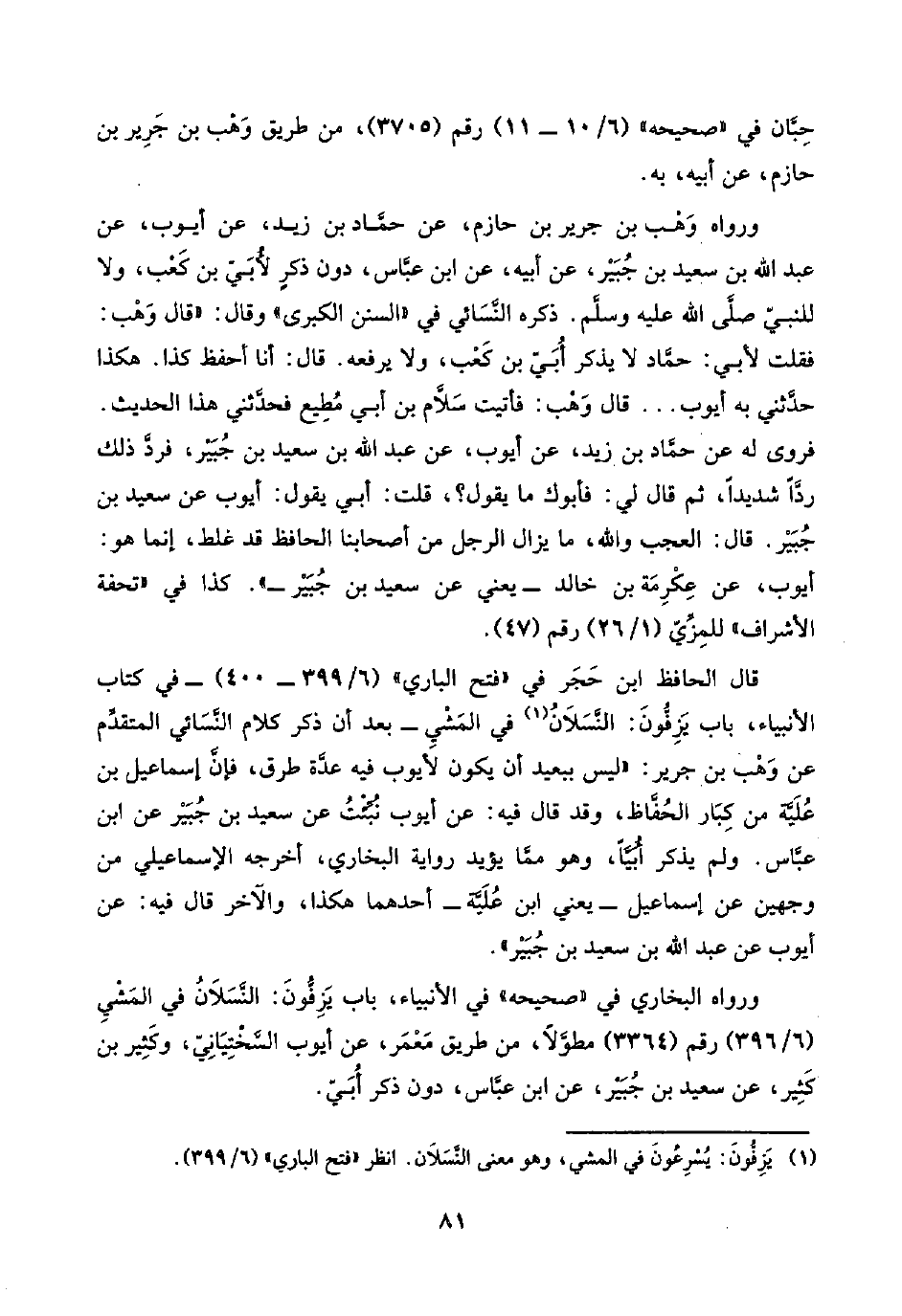 قال الحافظ ابن حَجَر في "فتح الباري" (٦/ ٣٩٩ - ٤٠٠) -في كتاب الأنبياء، باب يَزِفُّونَ: النَّسَلَانُ (¬١) في المَشْي- بعد أن ذكر كلام النَّسَائي المتقدِّم عن وَهْب بن جَرِير: "ليس ببعيد أن يكون الأيوب فيه عِدَّة طرق، فإنَّ إسماعيل بن عُلَيَّة من كِبَار الحُفَّاظ، وقد قال فيه: عن أيوب نُبِّئْتُ عن سعيد بن جُبَيْر عن ابن عبَّاس. ولم يذكر أُبَيًّا، وهو ممَّا يؤيد رواية البُخَاري، أخرجه الإسماعيلي من وجهين عن إسماعيل -يعني ابن عُلَيَّة- أحدهما هكذا، والآخر قال فيه: عن أيوب عن عبد اللَّه بن سعيد بن جُبَيْر".
