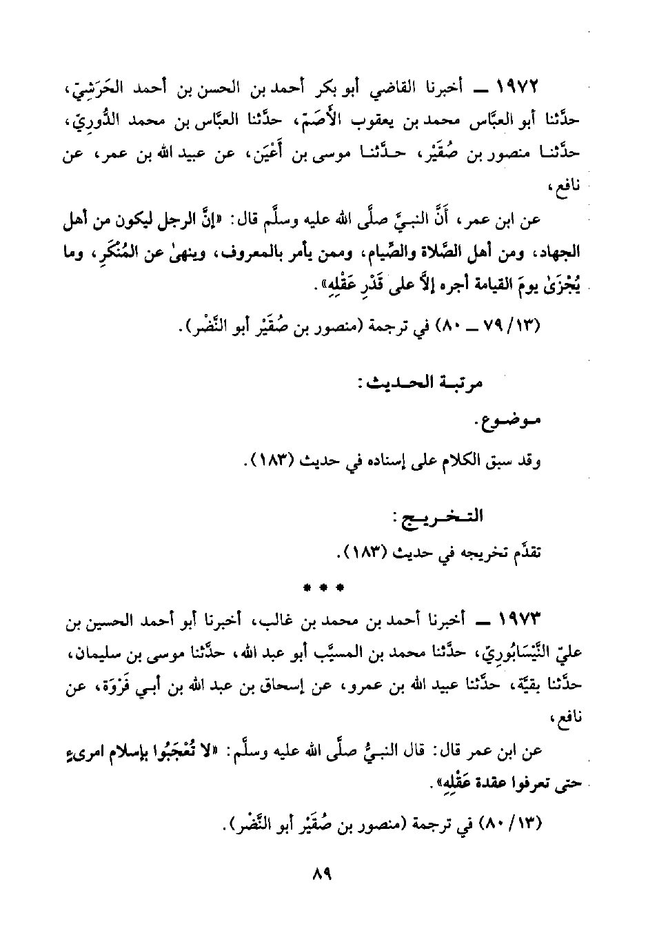 ١٩٧٢ - أخبرنا القاضي أبو بكر أحمد بن الحسن بن أحمد الحَرَشِيّ، حدَّثنا أبو العبَّاس محمد بن يعقوب الأَصَمّ، حدَّثنا العبَّاس بن محمد الدُّورِيّ، حدَّثنا منصور بن صُقِيْر، حدَّثنا موسى بن أَعْيَن، عن عبيد اللَّه بن عمر، عن نافع،