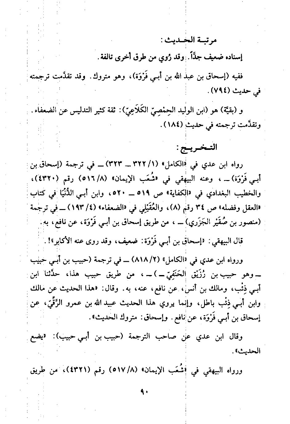رواه ابن عدي في "الكامل" (١/ ٣٢٢ - ٣٢٣) -في ترجمة (إسحاق بن أبي فَرْوَة) -، وعنه البيهقي في "شُعَب الإِيمان" (٨/ ٥١٦) رقم (٤٣٢٠)، والخطيب البغدادي في "الكفاية" ص ٥١٩ - ٥٢٠، وابن أبي الدُّنْيَا في كتاب "العقل وفضله" ص ٣٤ رقم (٨)، والعُقَيْلي في "الضعفاء" (٤/ ١٩٣) -في ترجمة منصور بن صُقَيْر الجَزَري) -، من طريق إسحاق بن أبي فَرْوَة، عن نافع، به.