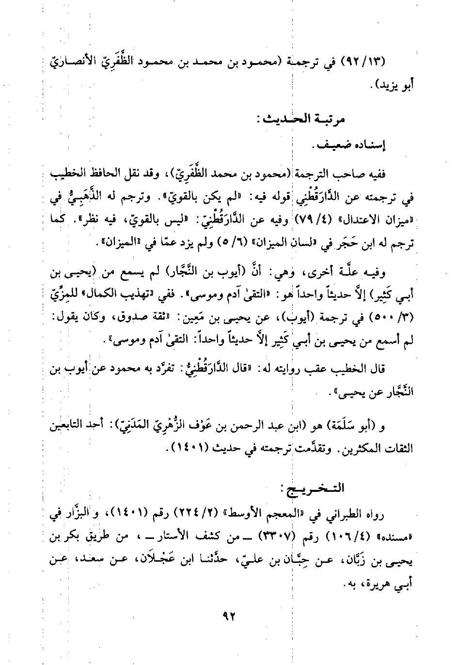 ففيه صاحب الترجمة (محمود بن محمد الظَّفَرِيّ)، وقد نقل الحافظ الخطيب في ترجمته عن الدَّارَقُطْنِيّ قوله فيه: "لم يكن بالقويّ". وترجم له الذَّهَبِيُّ في "ميزان الاعتدال" (٤/ ٧٩) وفيه عن الدَّارَقُطْنِيّ: "ليس بالقويّ، فيه نظر". كما ترجم له ابن حَجَر في "لسان الميزان" (٦/ ٥) ولم يزد عمّا في "الميزان".