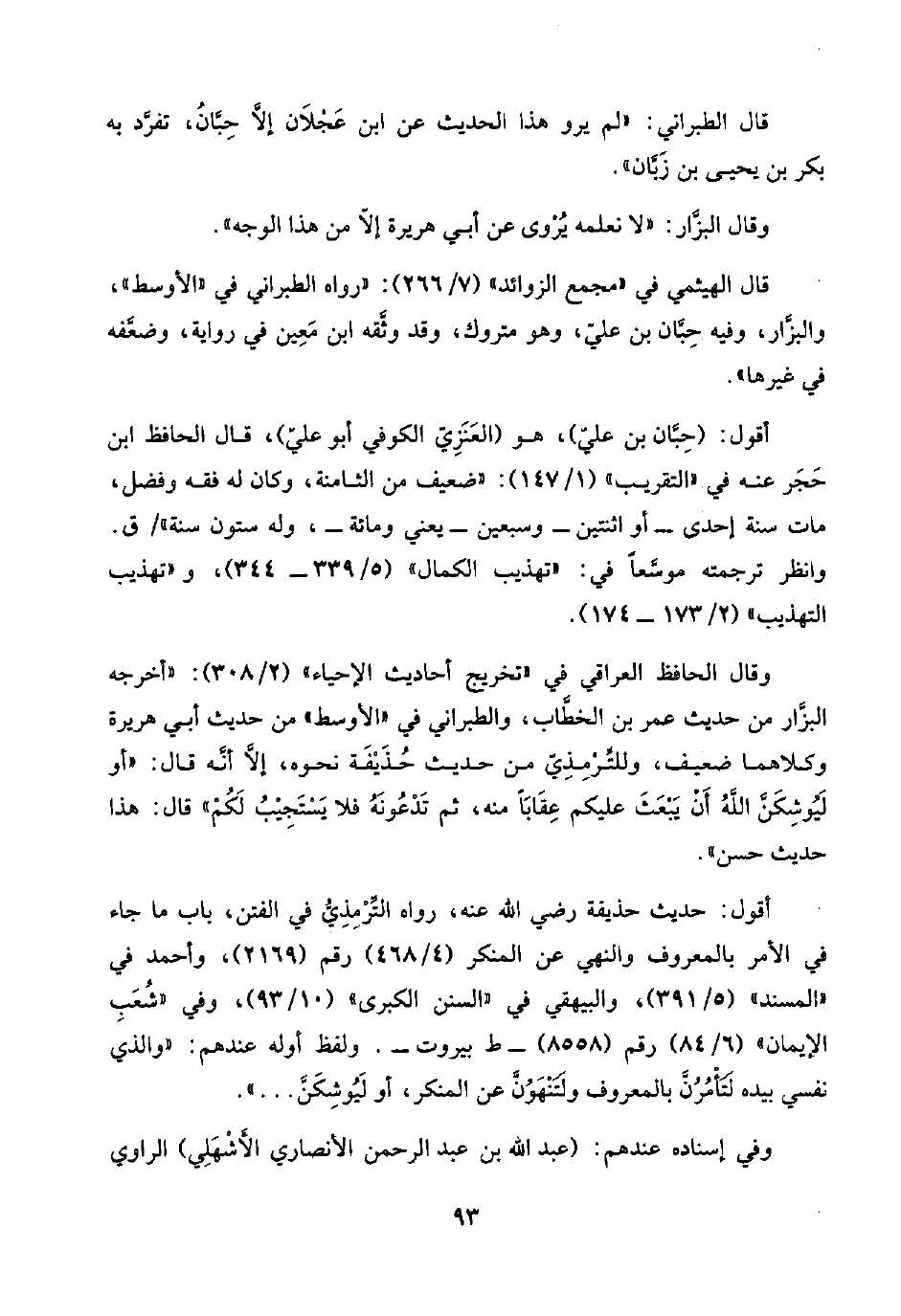 وقال الحافظ العِرَاقي في "تخريج أحاديث الإحياء" (٢/ ٣٠٨): "أخرجه البزَّار من حديث عمر بن الخَطَّاب، والطبراني في "الأوسط" من حديث أبي هريرة وكلاهما ضعيف، وللتِّرْمِذِيّ من حديث حُذَيْفَة نحوه، إلَّا أنَّه قال: "أو لَيُوشِكَنَّ اللَّهُ أَنْ يَبْعَثَ عليكم عِقَابًا منه، ثم تَدْعُونَهُ فلا يَسْتَجِيْبُ لَكُمْ" قال: هذا حديث حسن".