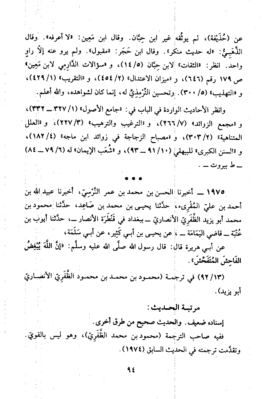 ١٩٧٥ - أخبرنا الحسن بن محمد بن عمر النَّرْسِيّ، أخبرنا عبيد اللَّه بن أحمد بن عليّ المُقْرِئ، حدَّثنا يحيى بن محمد بن صَاعِد، حدَّثنا محمود بن محمد أبو يزيد الظَّفَرِيّ الأنصاري -ببغداد في قَنْطَرَة الأنصار-، حدَّثنا أيوب بن عُتْبَة -قاضي اليَمَامَة-، عن يحيى بن أبي كَثِير، عن أبي سَلَمَة،