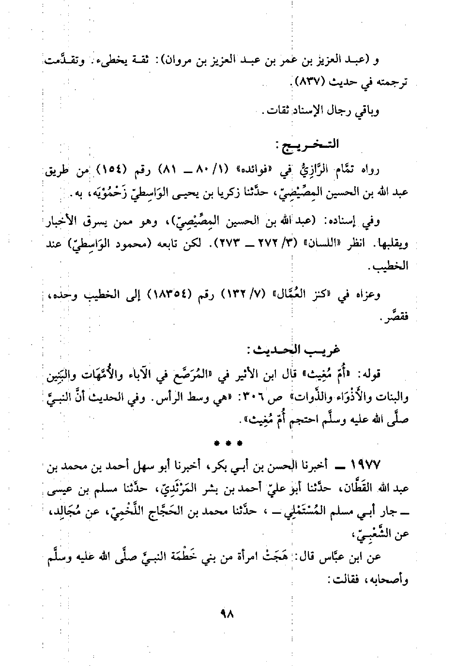 ١٩٧٧ - أخبرنا الحسن بن أبي بكر، أخبرنا أبو سهل أحمد بن محمد بن عبد اللَّه القَطَّان، حدَّثنا أبو عليّ أحمد بن بِشْر المَرْثَدِيّ، حدَّثنا مسلم بن عيسى -جار أبي مسلم المُسْتَمْلِي-، حدَّثنا محمد بن الحَجَّاج اللَّخْمِيّ، عن مُجَالِد، عن الشَّعْبِيّ،